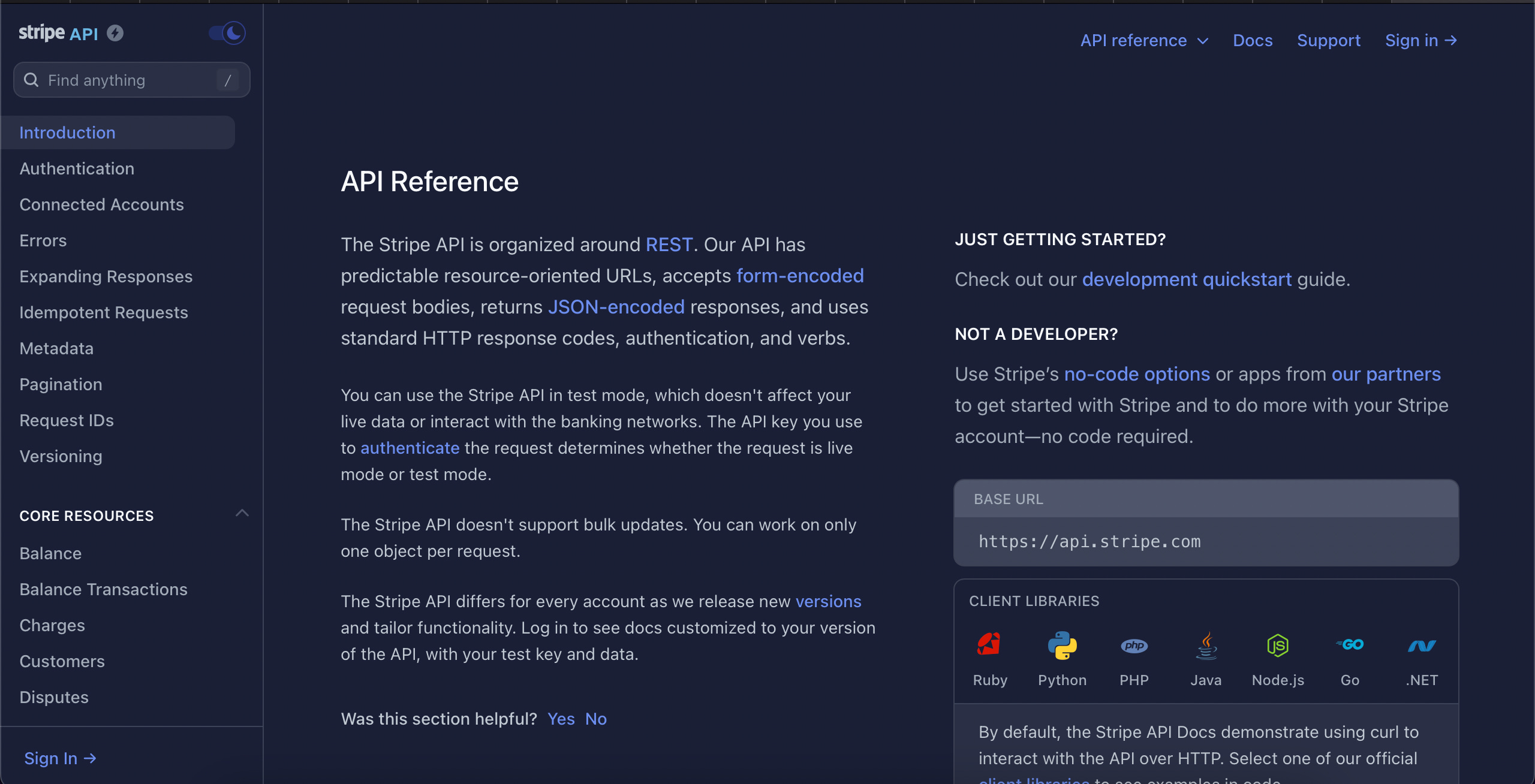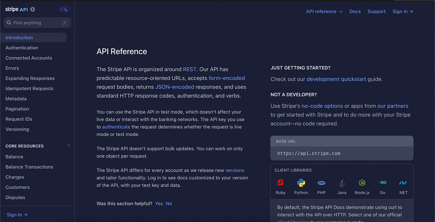 Stripe API Documentation Landing Page